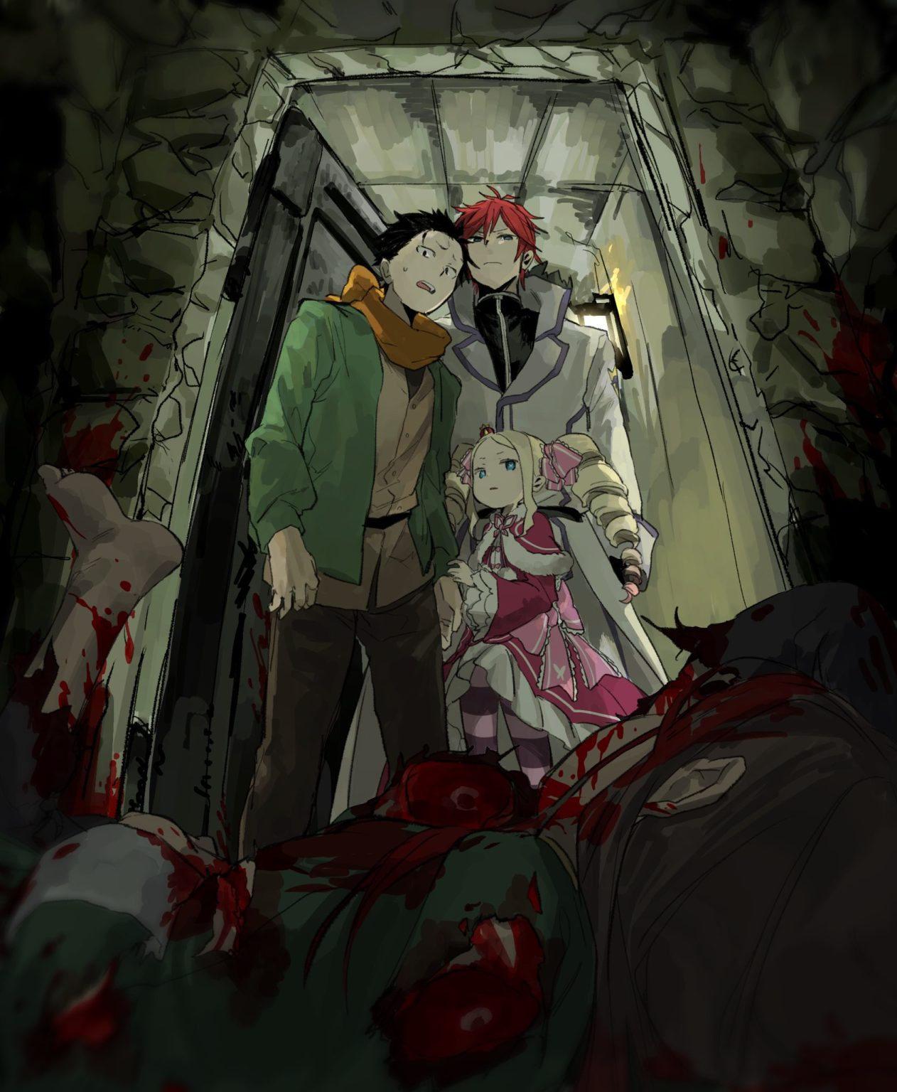 İstemsizce göğsünü tutup olduğu yere diz çöken Subaru’ya, onunla birlikte dışarı sürüklenen Beatrice şaşkın gözlerle bakıyordu. Telaşla sağa sola koşturan, başını ve omzunu pıt pıtlayan Beatrice’in ellerine teslim olurken Subaru o çarpıcı manzara karşısında göğsüne saplanan ağrıyı hissetti.