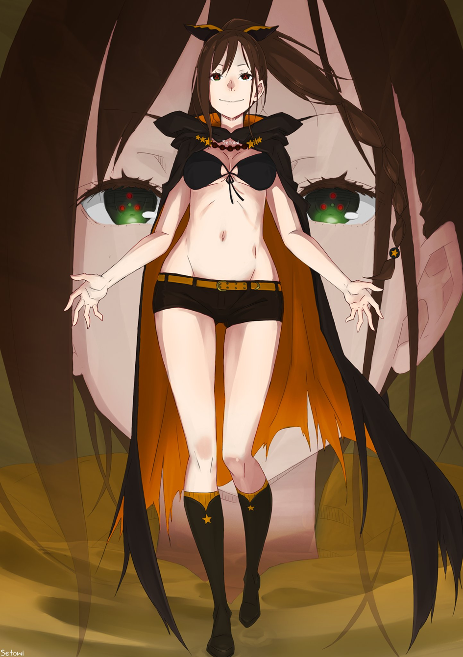 Siyaha yakın kahverengi saçları atkuyruğu şekilinde toplanan kadın cüretkâr bir şekilde yürüyor, karnı ve sırtı kıyafetlerinin açıklığından sergileniyordu, ona yarı çıplak demekte sakınca yoktu. Göğsü ve kasıkları zar zor kapanmış, kıyafetlerinin üzerine siyah bir manto atmıştı. Oldukça tuhaf giyimli biriydi.