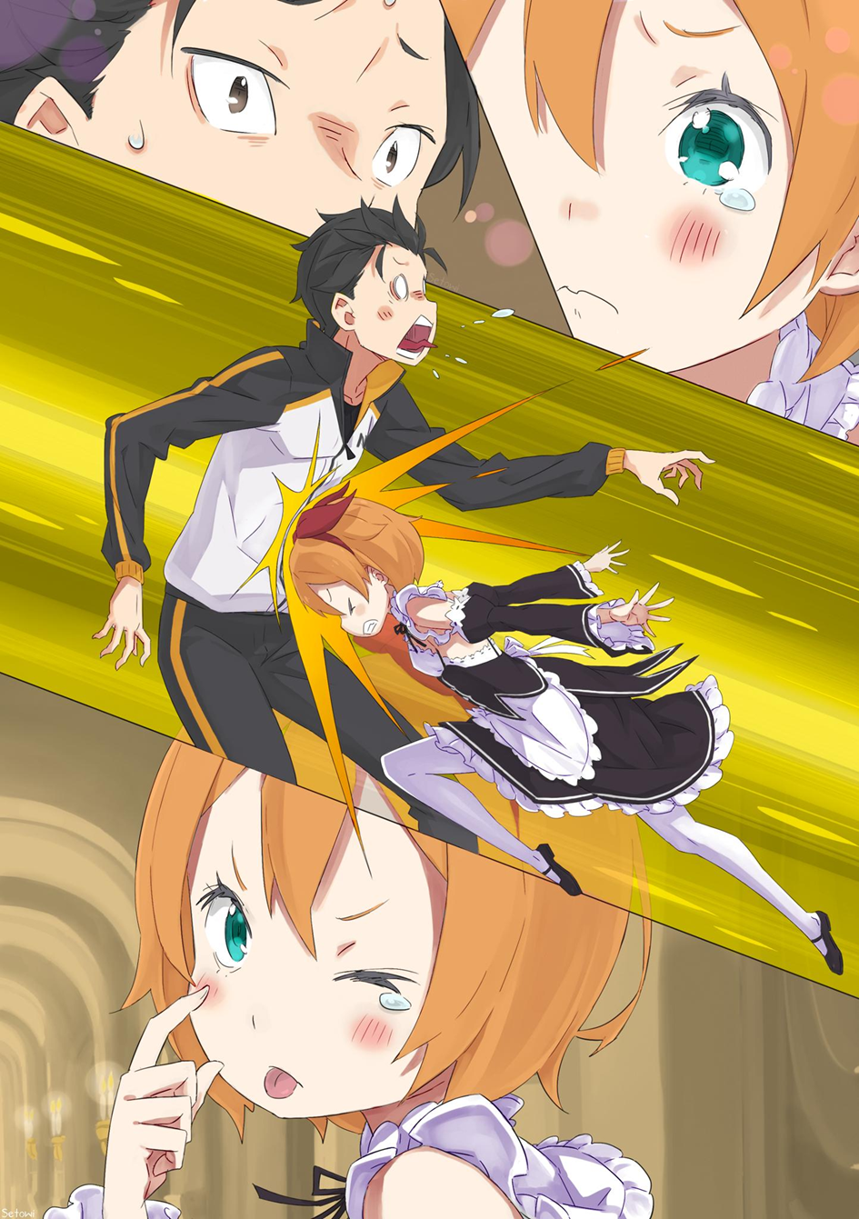 Hizmetli üniforması -ki minyon bedenine pek yakışıyordu- sallanırken soğuk, net bir surat ifadesiyle malikânede aceleyle dolaşıyordu. Subaru ise onun arkasından ilerliyor ve bir yandan koştururken bir yandan da özürler dileyerek onun moralini düzeltecek bir şeyler söylemeye çalışıyordu.