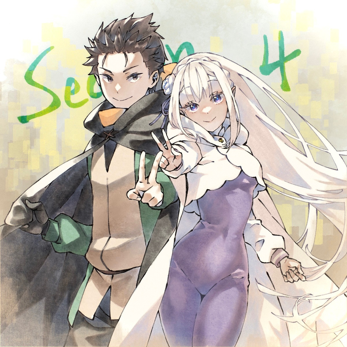 Subaru, yeniden yüzünü örtmüş olan Emilia’nın önünde dururken rüzgâra karşı koruma sağlayacak şekilde yürümeye başladı.