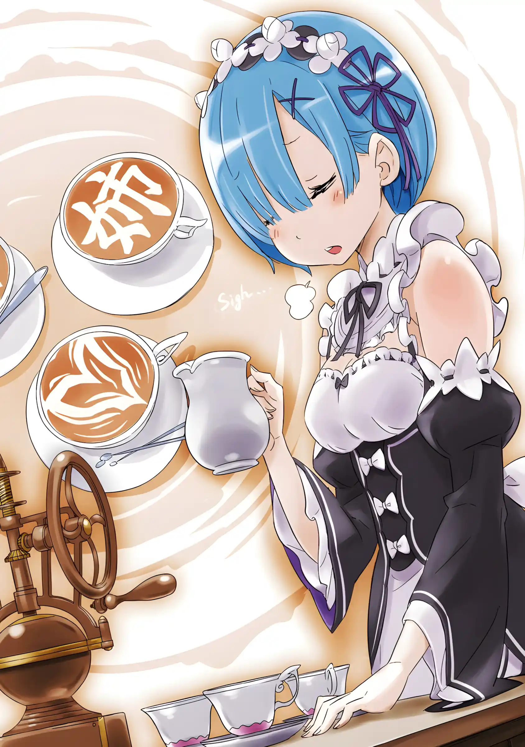 Rem’in şu anki durumu, Ram gelene kadar (Rem geri dönmeyince işten usanmış olarak) zamanı önemsemeyip latte sanatıyla en iyisini yapmaya çalışmasıydı.