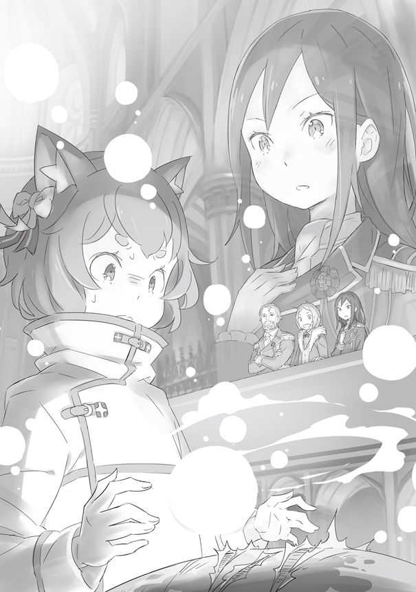 Ejder arabası sarayın ana kapısına yanaşır yanaşmaz coşkulu bir ses duyuldu. Meckart dışarı eğildi ve sarı saçlı bir çocuğu—— Lugunica Krallığı’nın Dördüncü Prensi Fourier’i, kendisinden önce arabadan inen Crusch’u geniş bir gülümsemeyle karşılarken gördü.